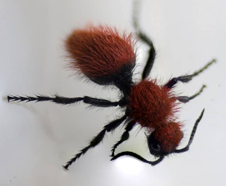 Adults about 1/8″-1″ (3-23 mm) long. Color black with areas of often very bright red orange yellow or white. Females wingless ant-like but lack node on pedicel densely covered with hairlike setae giving a fuzzy or velvet appearance and with a long smooth stinger. Males winged wasp-like hairiness usually much reduced coloring usually dull and different from females and lack a stinger.
